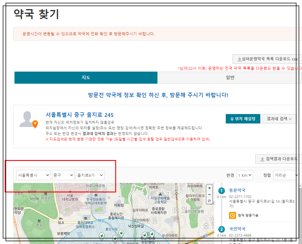 이 곳에는 약국 찾기, 병원 찾기가 모두 가능한 곳입니다.