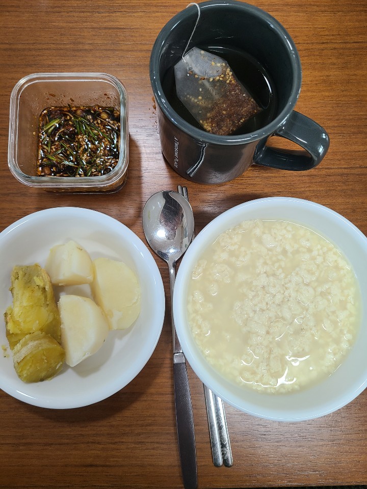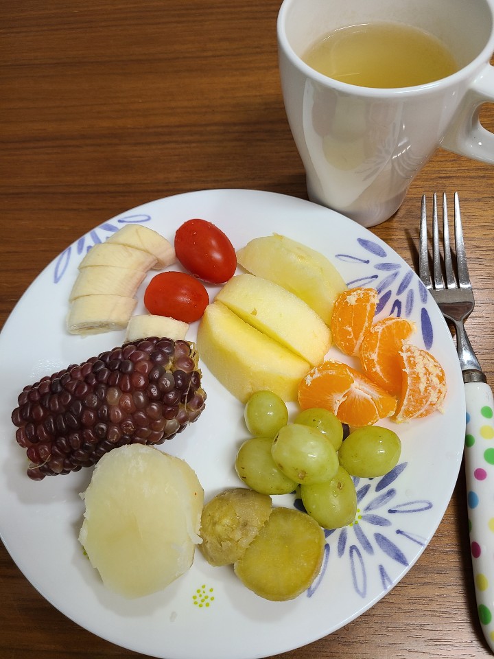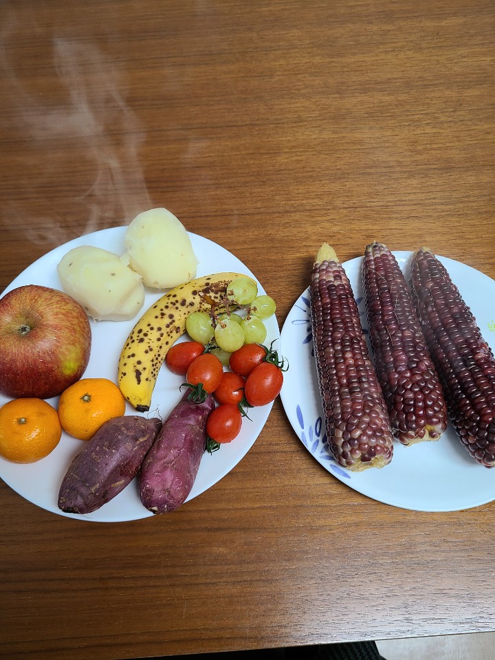 이 날은 옥수수를 준비하지 못한 날입니다. 고구마와 감자 그리고 과일, 따뜻한 차 한 잔입니다.